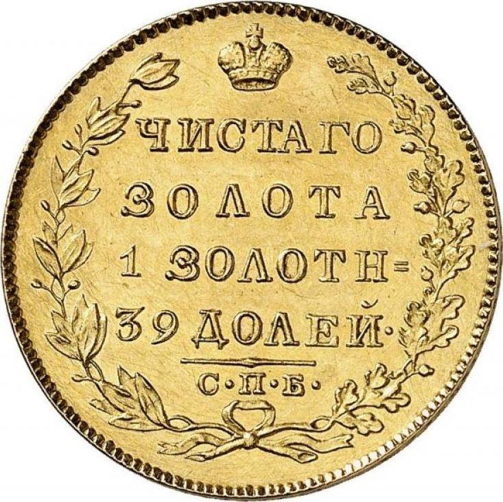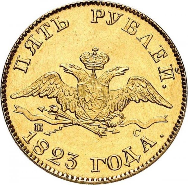 According to the latest data as of December 6, 2025 the average price of a Gold coin 5 Roubles 1823 "An eagle with lowered wings" with mark СПБ ПС is 2200 USD. The coin contains 5,9972 g of pure gold, so we do not recommend selling it for less than 809,3 USD, even if it is in poor condition and has no collectible value.