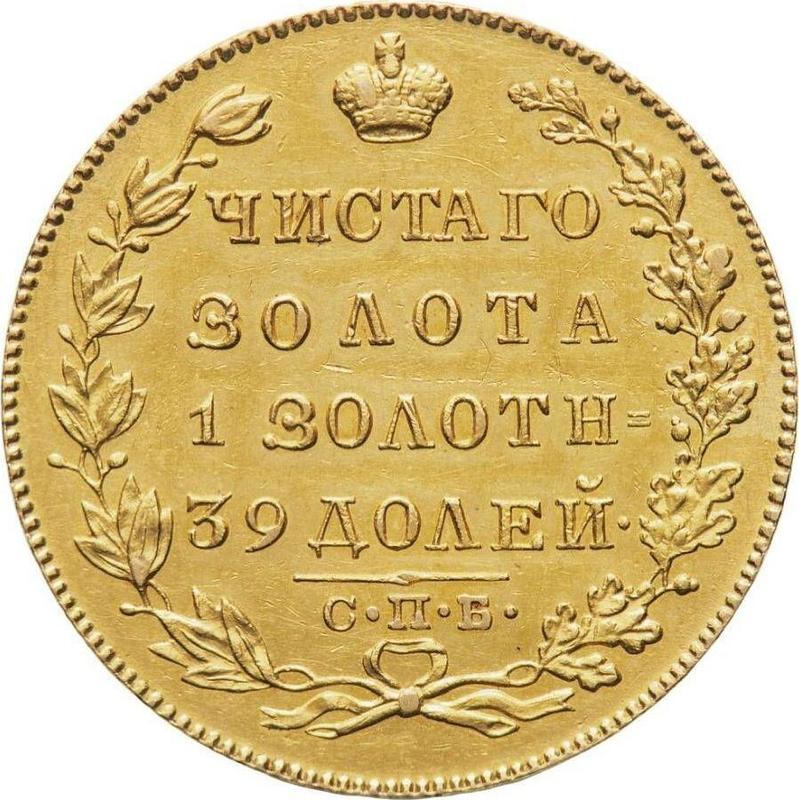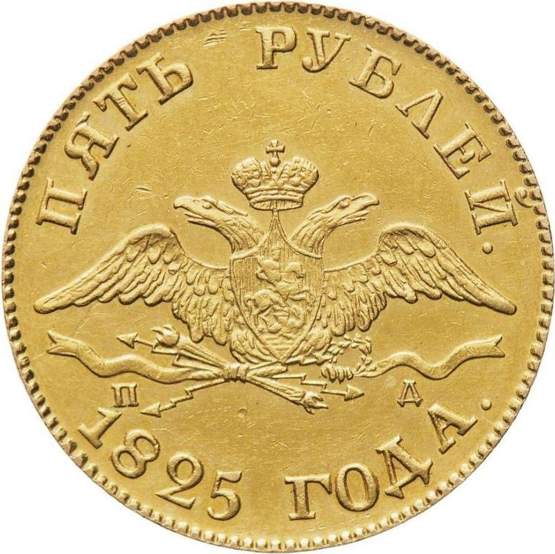 According to the latest data as of December 5, 2025 the average price of a Gold coin 5 Roubles 1825 "An eagle with lowered wings" with mark СПБ ПД is 4200 USD. The coin contains 5,9972 g of pure gold, so we do not recommend selling it for less than 816,64 USD, even if it is in poor condition and has no collectible value.