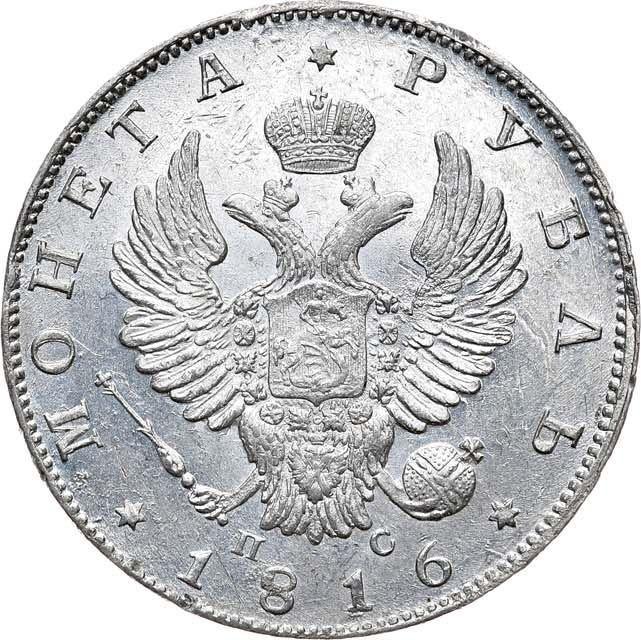 Find out the current coin value of the Russian Rouble 1816 "An eagle with raised wings" with mark СПБ ПС. Eagle 1814. This silver coin from the times of Alexander I struck at the Saint Petersburg Mint. Wondering how much a coin like this is worth? The record price belongs to the lot 723 sold at the SINCONA AG auction for CHF 3,000. Bidding took place October 9, 2012.