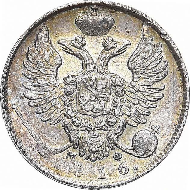 The information on the current value of the Russian coin 10 Kopeks 1816 "An eagle with raised wings" with the letters СПБ МФ is based on actual auction sales of similar specimens. To reflect the current price level, our service monitors over 590 numismatic companies and records auction results in the coin catalog and auction archive. Please note that the exact value depends directly on the coin's condition, so the average price serves only as an approximate estimate.