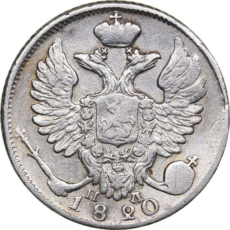 The information on the current value of the Russian coin 10 Kopeks 1820 "An eagle with raised wings" with the letters СПБ ПД is based on actual auction sales of similar specimens. To reflect the current price level, our service monitors over 590 numismatic companies and records auction results in the coin catalog and auction archive. Please note that the exact value depends directly on the coin's condition, so the average price serves only as an approximate estimate.
