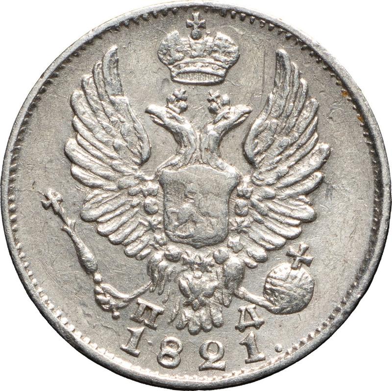 The information on the current value of the Russian coin 5 Kopeks 1821 "An eagle with raised wings" with the letters СПБ ПД is based on actual auction sales of similar specimens. To reflect the current price level, our service monitors over 590 numismatic companies and records auction results in the coin catalog and auction archive. Please note that the exact value depends directly on the coin's condition, so the average price serves only as an approximate estimate.