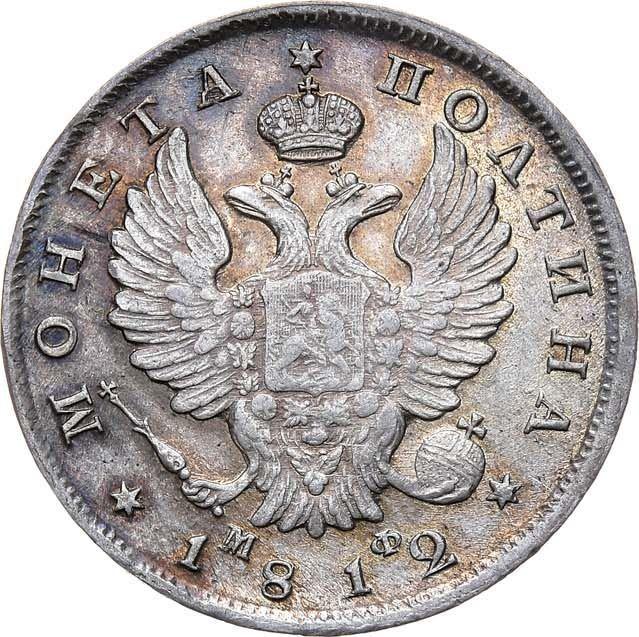 Find out the current coin value of the Russian Poltina 1812 "An eagle with raised wings" with mark СПБ МФ. This silver coin from the times of Alexander I struck at the Saint Petersburg Mint. Wondering how much a coin like this is worth? The record price belongs to the lot 906 sold at the Fritz Rudolf Künker GmbH & Co. KG auction for EUR 7,000. Bidding took place January 29, 2015.