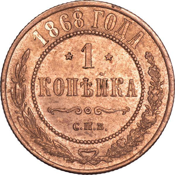 The information on the current value of the Russian coin 1 Kopek 1868 with the letters СПБ is based on actual auction sales of similar specimens. To reflect the current price level, our service monitors over 590 numismatic companies and records auction results in the coin catalog and auction archive. Please note that the exact value depends directly on the coin's condition, so the average price serves only as an approximate estimate.