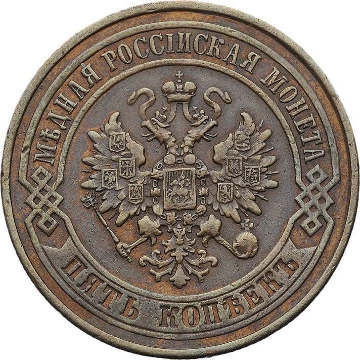 Find out the current coin value of the Russian 5 Kopeks 1869 with mark СПБ. This copper coin from the times of Alexander II struck at the Saint Petersburg Mint. Wondering how much a coin like this is worth? The record price belongs to the lot 7662 sold at the Gorny & Mosch Giessener Münzhandlung GmbH auction for EUR 2,300. Bidding took place October 15, 2009.