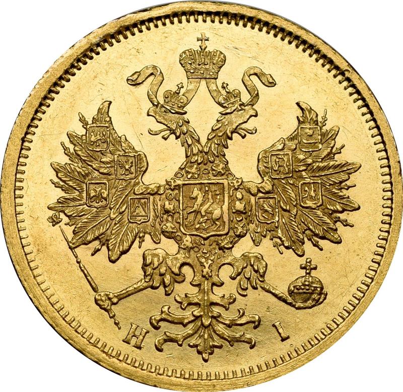 Find out the current coin value of the Russian 5 Roubles 1874 with mark СПБ НІ. This gold coin from the times of Alexander II struck at the Saint Petersburg Mint. Wondering how much a coin like this is worth? The record price belongs to the lot 723 sold at the Rare Coins auction for RUB 500,000. Bidding took place March 30, 2024.