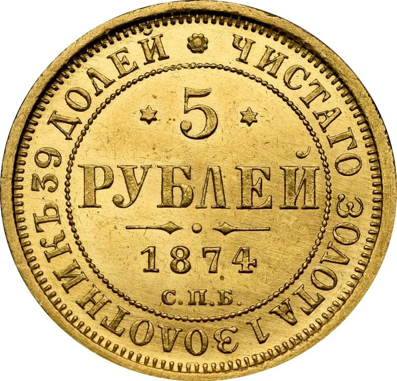 How much is the gold coin of Alexander II 5 Roubles 1874 СПБ НІ?