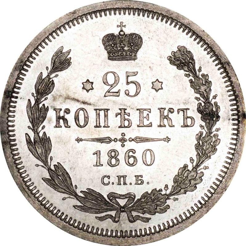 According to the latest data as of December 5, 2025 the average price of a Silver coin 25 Kopeks 1860 with mark СПБ ФБ, Weight 6.00 g is 270000 USD for regular strike and 200000 USD for coins minted using the PROOF technology.
