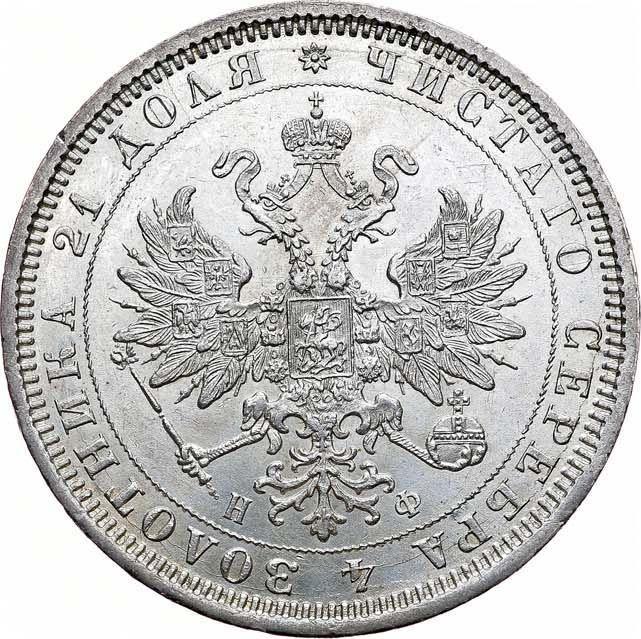 Find out the current coin value of the Russian Rouble 1878 with mark СПБ НФ. This silver coin from the times of Alexander II struck at the Saint Petersburg Mint. Wondering how much a coin like this is worth? The record price belongs to the lot 54 sold at the Rare Coins auction for USD 12,000. Bidding took place June 18, 2016.