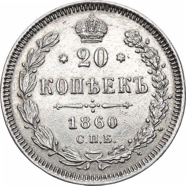 20 Kopeks 1860 СПБ ФБ "Type 1860-1866". The eagle has a wide tail. Narrow bow (Russia, Alexander II)