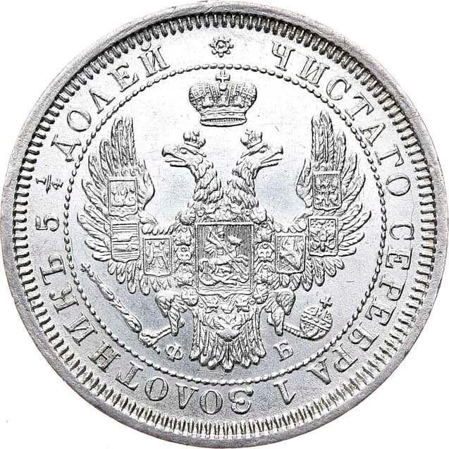 Find out the current coin value of the Russian 25 Kopeks 1856 with mark СПБ ФБ. This silver coin from the times of Alexander II struck at the Saint Petersburg Mint. Wondering how much a coin like this is worth? The record price belongs to the lot 1200 sold at the SINCONA AG auction for CHF 2,400. Bidding took place May 17, 2021.