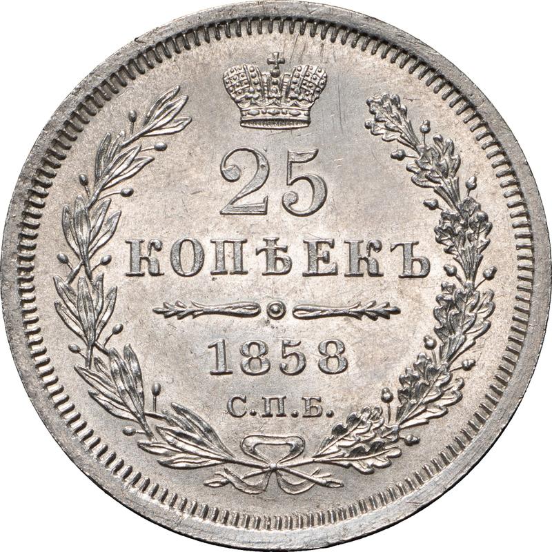 According to the latest data as of December 5, 2025 the average price of a Silver coin 25 Kopeks 1858 with mark СПБ ФБ is 480 USD for regular strike and 2500 USD for coins minted using the PROOF technology.