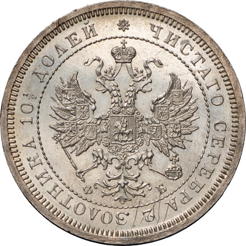 Find out the current coin value of the Russian Poltina 1859 with mark СПБ ФБ. Small crown. This silver coin from the times of Alexander II struck at the Saint Petersburg Mint. Wondering how much a coin like this is worth? The record price belongs to the lot 338 sold at the Rare Coins auction for RUB 750,000. Bidding took place December 4, 2021.