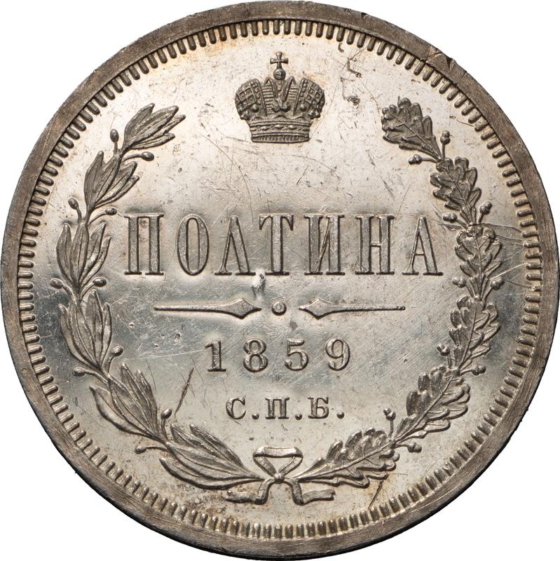 According to the latest data as of December 6, 2025 the average price of a Silver coin Poltina 1859 with mark СПБ ФБ, Small crown is 420 USD for regular strike and 3100 USD for coins minted using the PROOF technology.