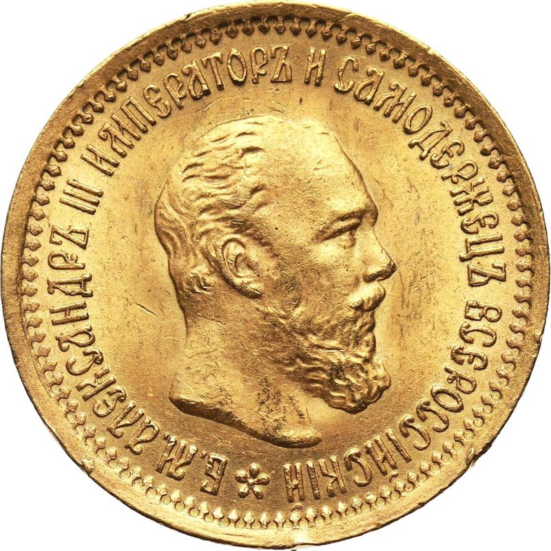 Find out the current coin value of the Russian 5 Roubles 1889 "Portrait with a short beard" with mark (АГ). This gold coin from the times of Alexander III struck at the Saint Petersburg Mint. Wondering how much a coin like this is worth? The record price belongs to the lot 1204 sold at the Katz Auction auction for EUR 8,600. Bidding took place May 14, 2022.