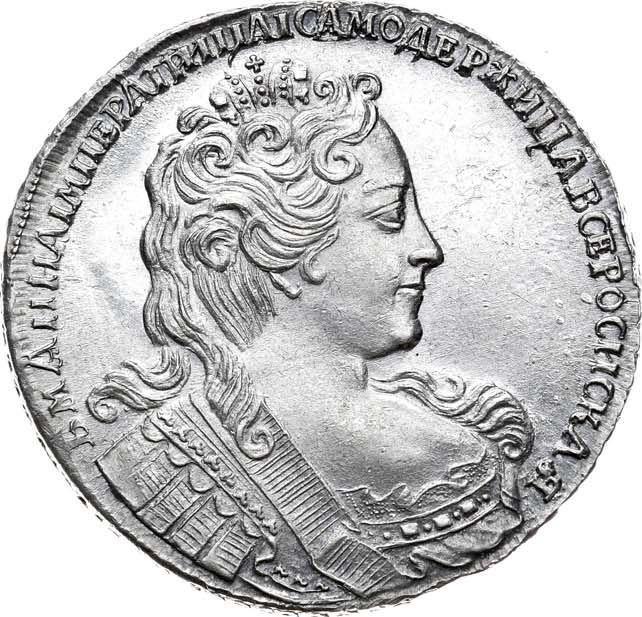 How much is the silver coin of Anna Ioannovna Rouble 1731 "The corsage is parallel to the circumference", Without the brooch on chest, A curl behind the ear?