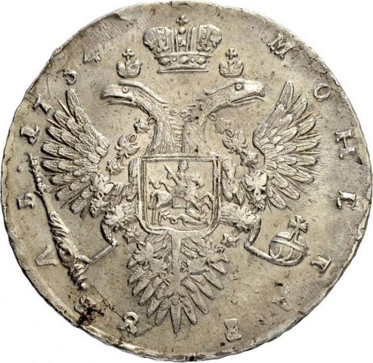 Rouble 1734 "The corsage is parallel to the circumference". Without the brooch on chest. Without a curl of hair behind the ear (Russia, Anna Ioannovna)