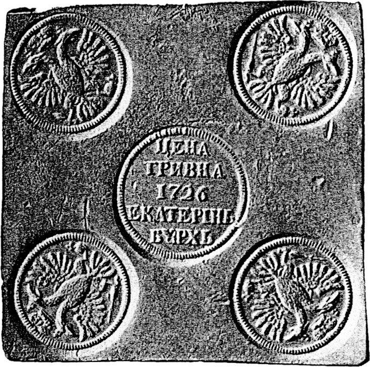 Pattern Grivna (10 Kopeks) 1726 ЕКАТЕРIНЬБУРХЬ "Square plate". Restrike. Eagles without shields (Russia, Catherine I)