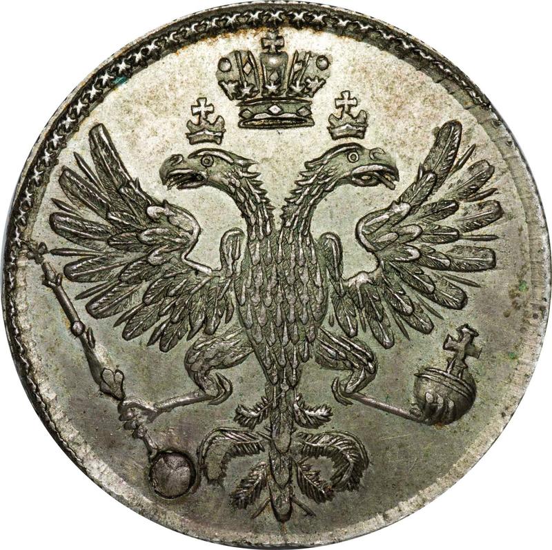 Pattern Polpoltiny (1/4 Rouble) 1726 СПБ. "СПБ" is separated by dots (Russia, Catherine I)