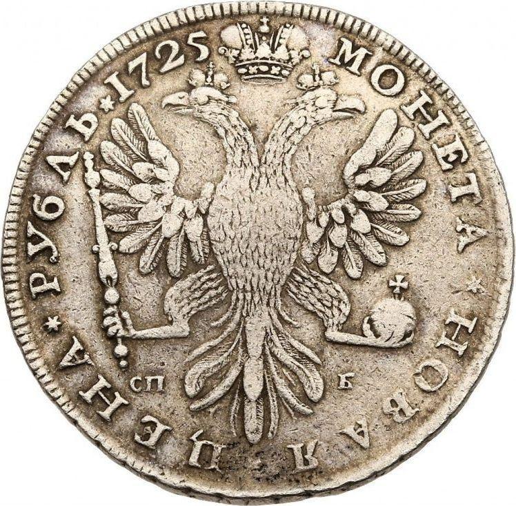Find out the current coin value of the Russian Rouble 1725 "Petersburg type, portrait to the left" with mark СПБ-СПБ. "СПБ" at the beginning of the inscription and under the eagle. This silver coin from the times of Catherine I struck at the Saint Petersburg Mint. Wondering how much a coin like this is worth? The record price belongs to the lot 25 sold at the AURORA auction for RUB 1,857,000. Bidding took place June 4, 2019.