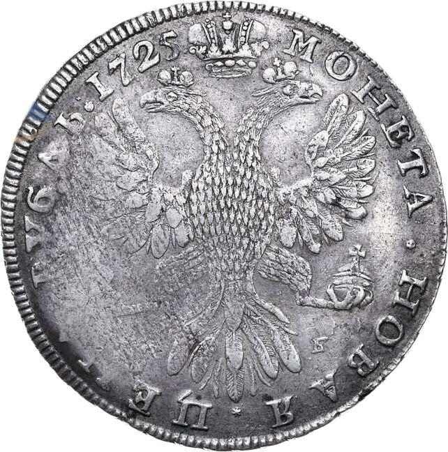 Find out the current coin value of the Russian Rouble 1725 "Petersburg type, portrait to the left" with mark СПБ. "СПБ" under the eagle. Eagle's tail fanned out. This silver coin from the times of Catherine I struck at the Saint Petersburg Mint. Wondering how much a coin like this is worth? The record price belongs to the lot 68 sold at the Russian Heritage auction for USD 5,750. Bidding took place April 21, 2019.