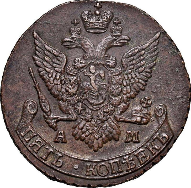 Find out the current coin value of the Russian 5 Kopeks 1793 "Anninsk Mint" with mark АМ. This copper coin from the times of Catherine II struck at the Anninsk Mint. Wondering how much a coin like this is worth? The record price belongs to the lot 25363 sold at the Heritage Auctions auction for USD 1,265. Bidding took place April 25, 2012.