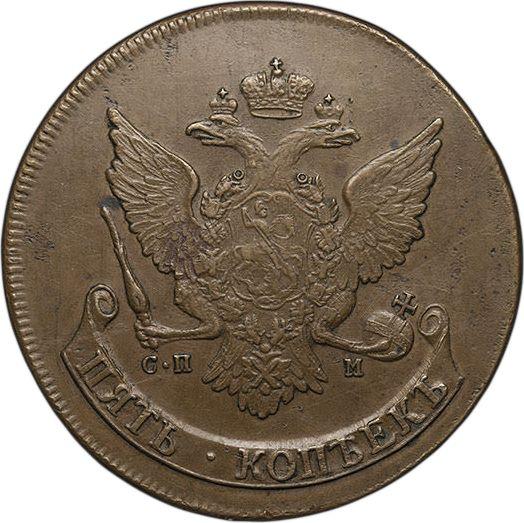 Find out the current coin value of the Russian 5 Kopeks 1781 "Saint Petersburg Mint" with mark СПМ. Restrike. Plain edge. This copper coin from the times of Catherine II struck at the Saint Petersburg Mint. Wondering how much a coin like this is worth? The record price belongs to the lot 186 sold at the Russian Heritage auction for USD 800. Bidding took place April 22, 2018.