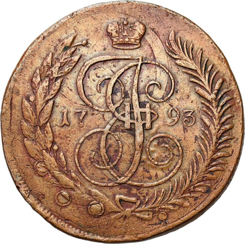 Find out the current coin value of the Russian 5 Kopeks 1793 "Pavlovsky re-minted of 1797" with mark ЕМ. Edge mesh. This copper coin from the times of Catherine II struck at the Nizhny Novgorod, Red, Saint Petersburg Mint. Wondering how much a coin like this is worth? The record price belongs to the lot 475 sold at the Rare Coins auction for USD 12,500. Bidding took place November 12, 2016.