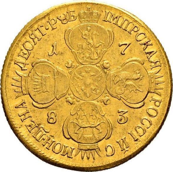 Find out the current coin value of the Russian 10 Roubles 1783 with mark СПБ. Restrike. This gold coin from the times of Catherine II struck at the Saint Petersburg Mint