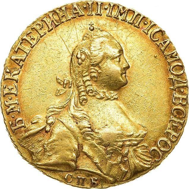 Find out the current coin value of the Russian 5 Roubles 1765 "With a scarf" with mark СПБ. This gold coin from the times of Catherine II struck at the Saint Petersburg Mint. Wondering how much a coin like this is worth? The record price belongs to the lot 438 sold at the Rare Coins auction for USD 18,000. Bidding took place November 11, 2017.