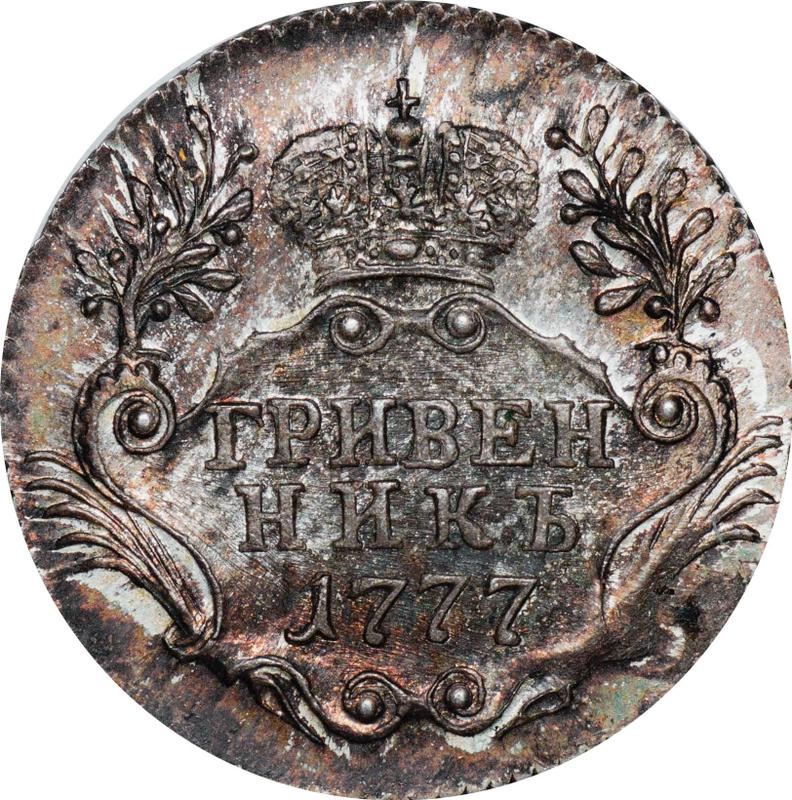 Find out the current coin value of the Russian Grivennik (10 Kopeks) 1777 with mark СПБ. Restrike. This silver coin from the times of Catherine II. Wondering how much a coin like this is worth? The record price belongs to the lot 97 sold at the RND auction for RUB 1,350,000. Bidding took place February 28, 2016.