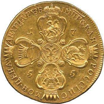 Find out the current coin value of the Russian Pattern 20 Roubles 1755 with mark СПБ. This gold coin from the times of Elizabeth struck at the Saint Petersburg Mint