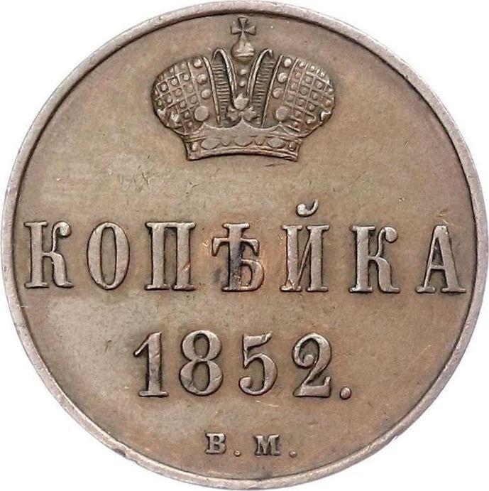 Find out the current coin value of the Russian 1 Kopek 1852 "Warsaw Mint" with mark ВМ. This copper coin from the times of Nicholas I struck at the Warsaw Mint. Wondering how much a coin like this is worth? The record price belongs to the lot 1152 sold at the SINCONA AG auction for CHF 600. Bidding took place October 9, 2012.