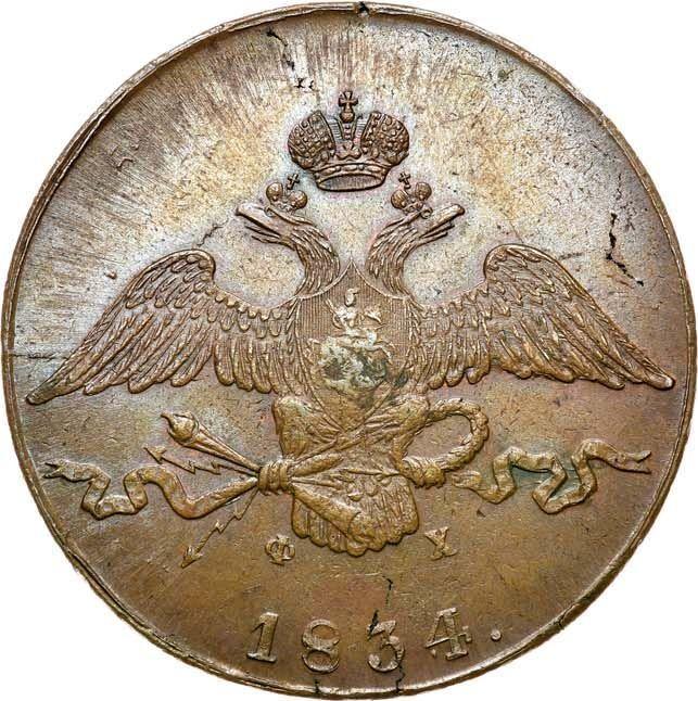 Find out the current coin value of the Russian 10 Kopeks 1834 with mark ЕМ ФХ. This copper coin from the times of Nicholas I struck at the Yekaterinburg Mint. Wondering how much a coin like this is worth? The record price belongs to the lot 30597 sold at the Heritage Auctions auction for USD 3,290. Bidding took place January 4, 2015.