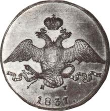 Find out the current coin value of the Russian 10 Kopeks 1837 with mark ЕМ КТ. Restrike. This copper coin from the times of Nicholas I