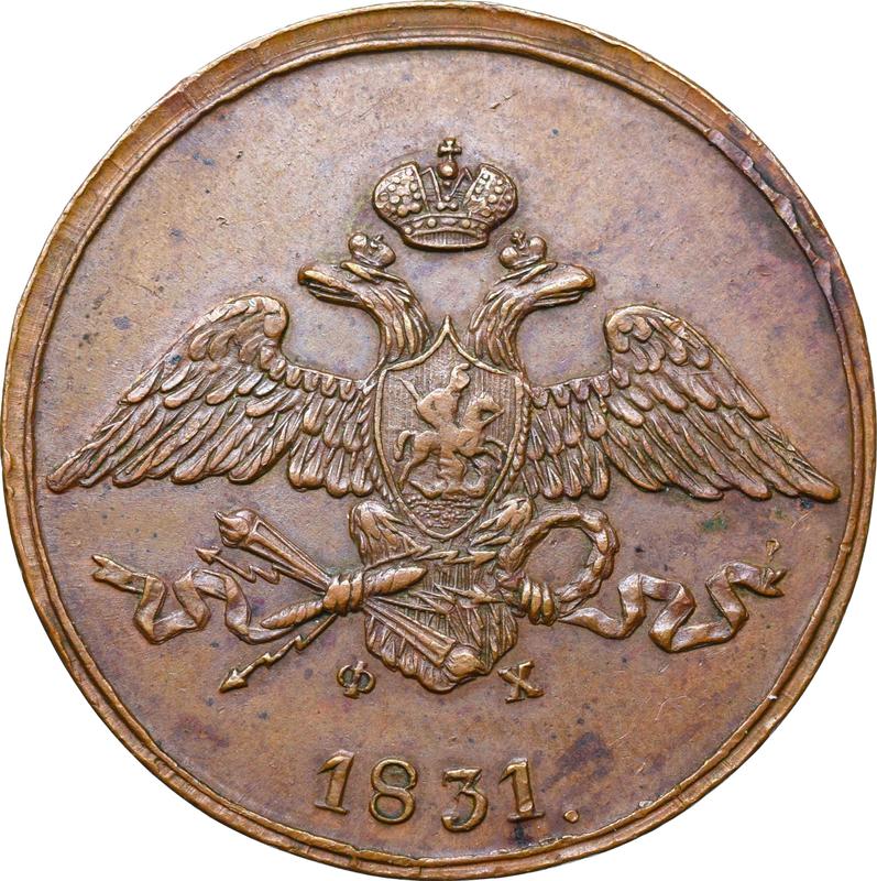 Find out the current coin value of the Russian 5 Kopeks 1831 "An eagle with lowered wings" with mark ЕМ ФХ. This copper coin from the times of Nicholas I struck at the Yekaterinburg Mint. Wondering how much a coin like this is worth? The record price belongs to the lot 20 sold at the Luxcoins auction for RUB 1,170,000. Bidding took place June 29, 2025.