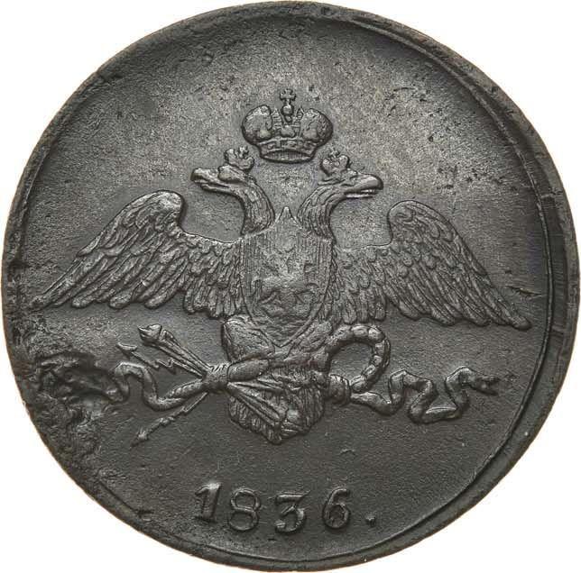 Find out the current coin value of the Russian 5 Kopeks 1836 "An eagle with lowered wings" with mark СМ. This copper coin from the times of Nicholas I struck at the Suzun Mint. Wondering how much a coin like this is worth? The record price belongs to the lot 208 sold at the Russian Heritage auction for RUB 190,000. Bidding took place August 30, 2025.
