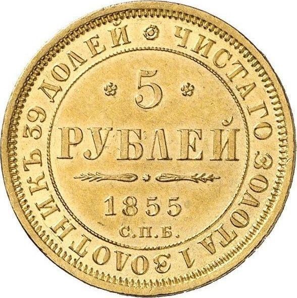 The information on the current value of the Russian coin 5 Roubles 1855 with the letters СПБ АГ is based on actual auction sales of similar specimens. To reflect the current price level, our service monitors over 590 numismatic companies and records auction results in the coin catalog and auction archive. Please note that the exact value depends directly on the coin's condition, so the average price serves only as an approximate estimate.