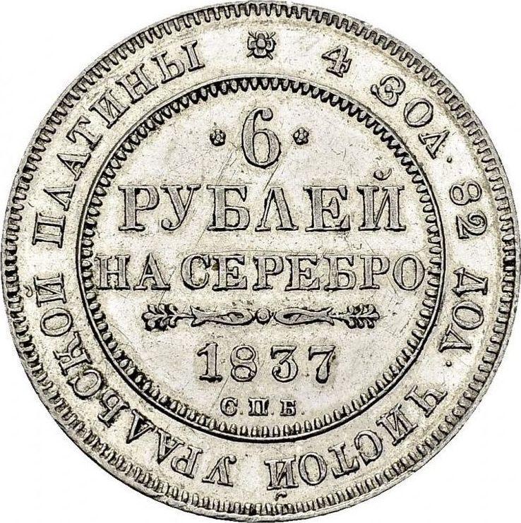 Find out the current coin value of the Russian 6 Roubles 1837 with mark СПБ. This platinum coin from the times of Nicholas I. Wondering how much a coin like this is worth? The record price belongs to the lot 273 sold at the Chaponnière & Firmenich SA auction for CHF 85,000. Bidding took place July 5, 2017.