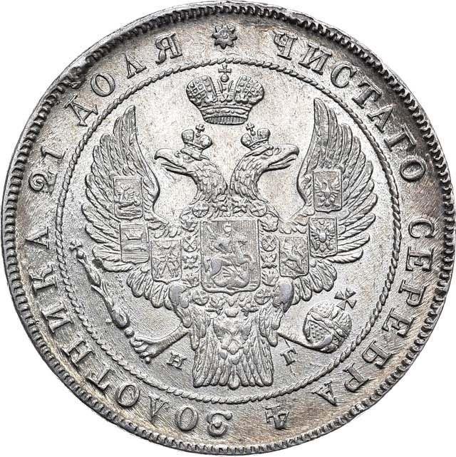 Find out the current coin value of the Russian Rouble 1834 "The eagle of the sample of 1832" with mark СПБ НГ. This silver coin from the times of Nicholas I struck at the Saint Petersburg Mint. Wondering how much a coin like this is worth? The record price belongs to the lot 87 sold at the The New York Sale auction for USD 29,000. Bidding took place January 14, 2025.