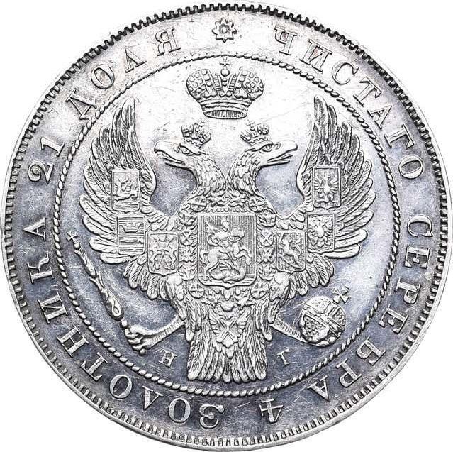 Find out the current coin value of the Russian Rouble 1838 "The eagle of the sample of 1844" with mark СПБ НГ. This silver coin from the times of Nicholas I struck at the Saint Petersburg Mint. Wondering how much a coin like this is worth? The record price belongs to the lot 77 sold at the Rare Coins auction for USD 17,500. Bidding took place November 10, 2018.