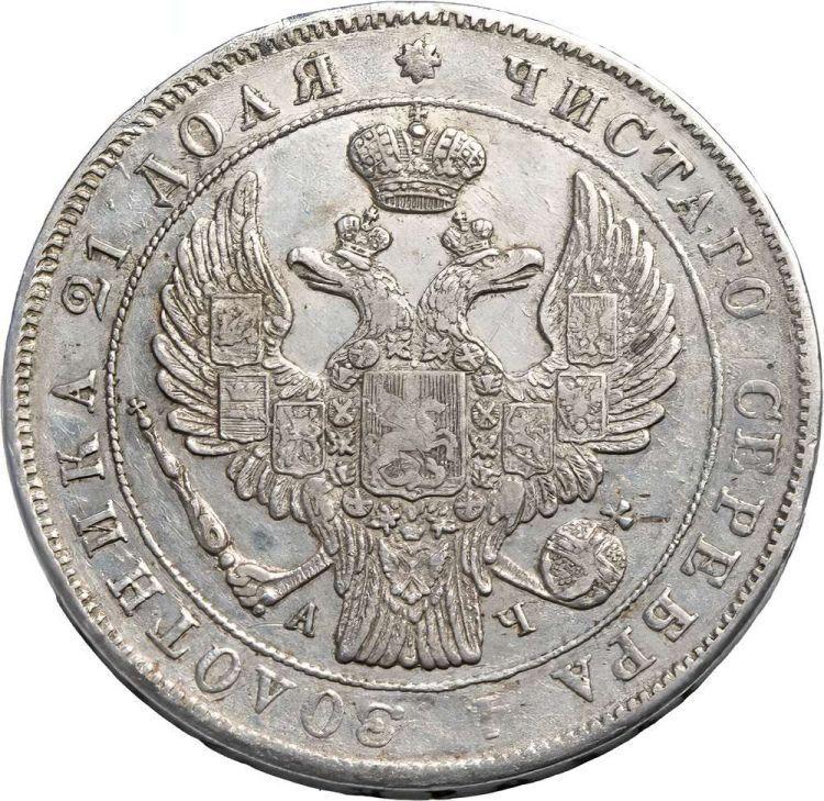 Find out the current coin value of the Russian Rouble 1842 "The eagle of the sample of 1844" with mark СПБ АЧ. Wreath 7 links. This silver coin from the times of Nicholas I struck at the Saint Petersburg Mint. Wondering how much a coin like this is worth? The record price belongs to the lot 2105 sold at the Numisbalt auction for EUR 2,600. Bidding took place June 30, 2021.