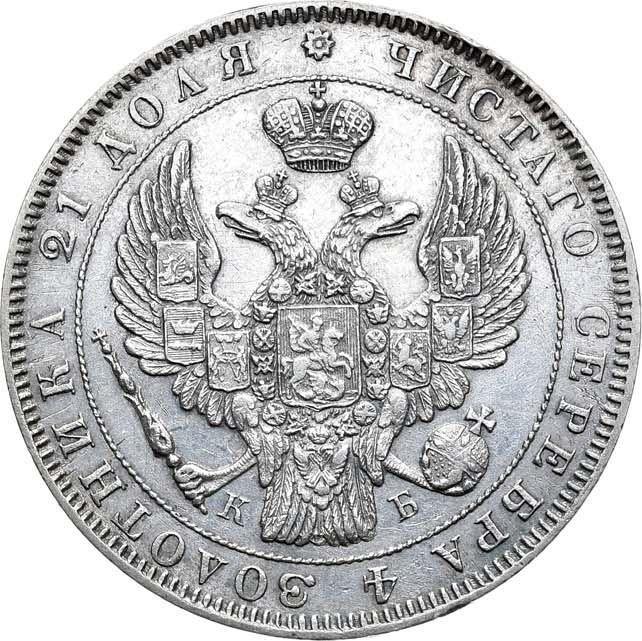 Find out the current coin value of the Russian Rouble 1844 "The eagle of the sample of 1844" with mark СПБ КБ. Small crown. This silver coin from the times of Nicholas I struck at the Saint Petersburg Mint. Wondering how much a coin like this is worth? The record price belongs to the lot 214 sold at the SINCONA AG auction for CHF 8,500. Bidding took place October 19, 2020.
