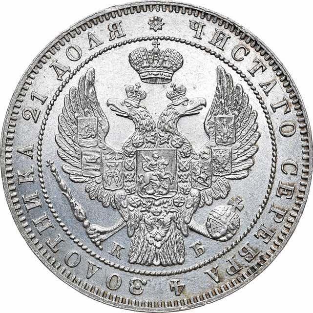 Find out the current coin value of the Russian Rouble 1844 "The eagle of the sample of 1844" with mark СПБ КБ. Big crown. This silver coin from the times of Nicholas I struck at the Saint Petersburg Mint. Wondering how much a coin like this is worth? The record price belongs to the lot 319 sold at the Rare Coins auction for RUB 2,500,000. Bidding took place December 4, 2021.