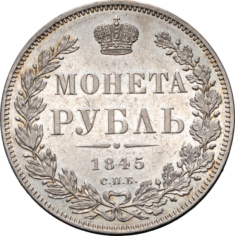 The information on the current value of the Russian coin Rouble 1845 "The eagle of the sample of 1844" with the letters СПБ КБ is based on actual auction sales of similar specimens. To reflect the current price level, our service monitors over 590 numismatic companies and records auction results in the coin catalog and auction archive. Please note that the exact value depends directly on the coin's condition, so the average price serves only as an approximate estimate.