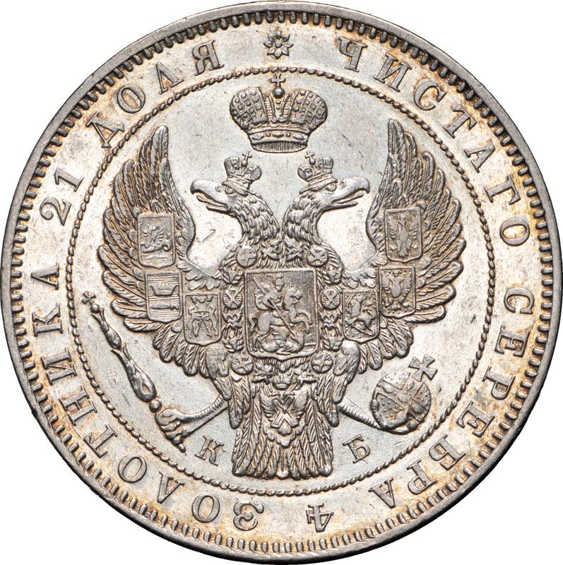 Find out the current coin value of the Russian Rouble 1845 "The eagle of the sample of 1844" with mark СПБ КБ. This silver coin from the times of Nicholas I struck at the Saint Petersburg Mint. Wondering how much a coin like this is worth? The record price belongs to the lot 1140 sold at the AB Philea & Myntkompaniet auction for EUR 5,400. Bidding took place November 14, 2020.