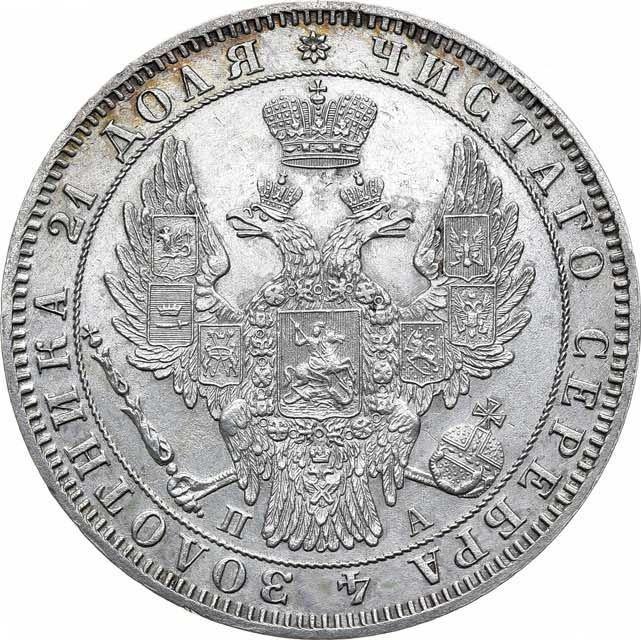 According to the latest data as of December 5, 2025 the average price of a Silver coin Rouble 1849 "New type" with mark СПБ ПА, St George without cloak is 1200 USD for regular strike and 1600 USD for coins minted using the PROOF technology.