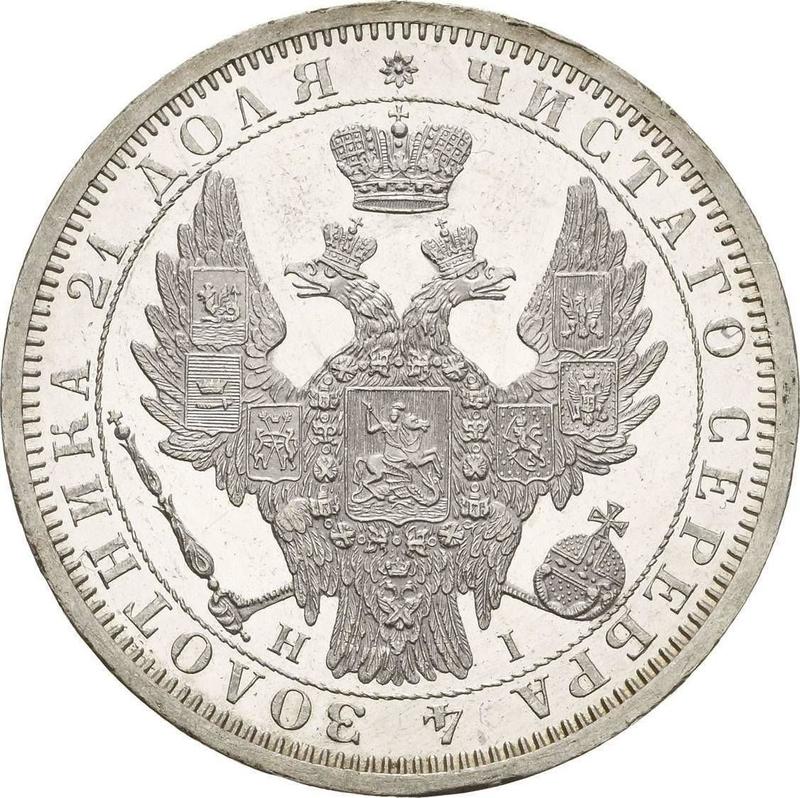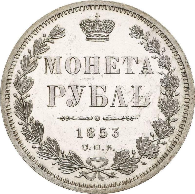 Find out the current coin value of the Russian Rouble 1853 "New type" with mark СПБ HI. The letters in the word "РУБЛЬ" are compressed. This silver coin from the times of Nicholas I struck at the Saint Petersburg Mint. Wondering how much a coin like this is worth? The record price belongs to the lot 141 sold at the Empire auction for RUB 800,000. Bidding took place October 18, 2008.