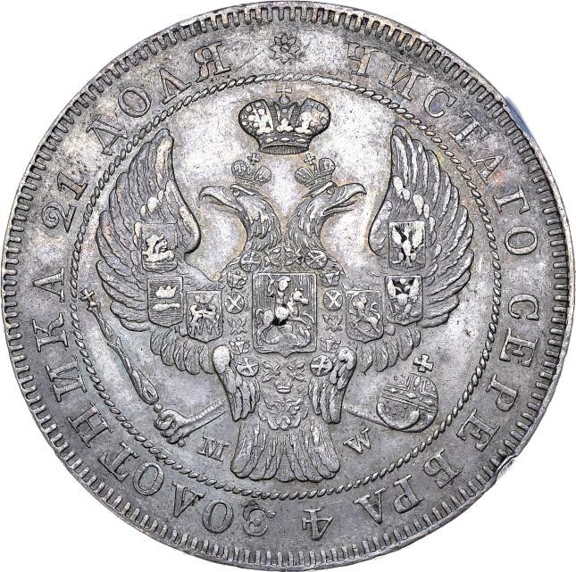 The information on the current value of the Russian coin Rouble 1843 "Warsaw Mint" with the letters MW, The eagle's tail is straight, Wreath 7 links is based on actual auction sales of similar specimens. To reflect the current price level, our service monitors over 590 numismatic companies and records auction results in the coin catalog and auction archive. Please note that the exact value depends directly on the coin's condition, so the average price serves only as an approximate estimate.