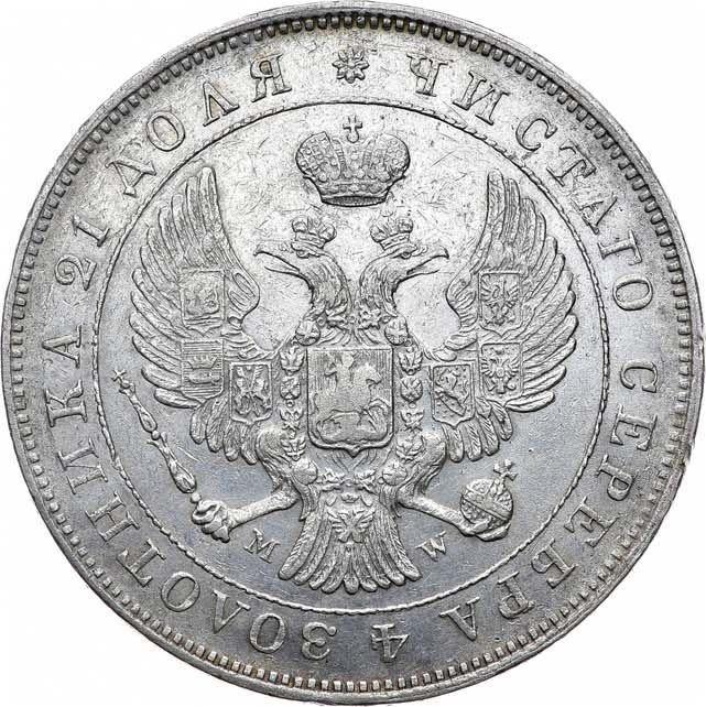 Find out the current coin value of the Russian Rouble 1843 "Warsaw Mint" with mark MW. Eagle's tail fanned out. Wreath 7 links. This silver coin from the times of Nicholas I struck at the Warsaw Mint. Wondering how much a coin like this is worth? The record price belongs to the lot 238 sold at the AURORA auction for RUB 420,000. Bidding took place November 27, 2025.